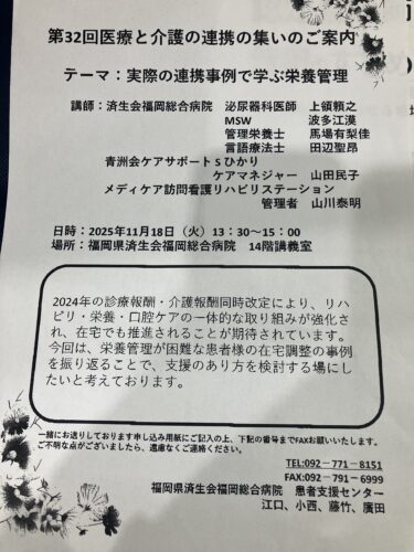 11月18日(火)、**済生会福岡総合病院 主催「第32回 医療と介護の連携会の集い」**に参加してきました!